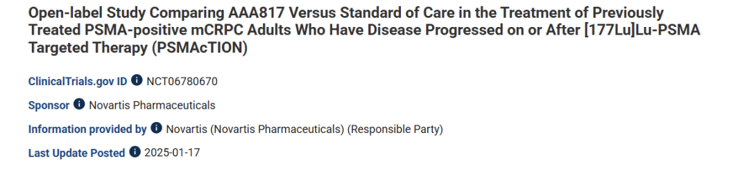 目前,AAA817在海外的临床进展较快,诺华已在ClinicalTrials网站登记了Ac-PSMA-617(AAA817)的临床Ⅱ/Ⅲ期试验。根据资料,该药物正在探索用于已接受雄激素受体抑制剂和紫杉烷类药物治疗,且在接受177Lu-PSMA治疗期间或之后仍出现疾病进展的PSMA阳性转移性去势抵抗性前列腺癌(mCRPC)患者中的疗效,预计将入组432名患者。