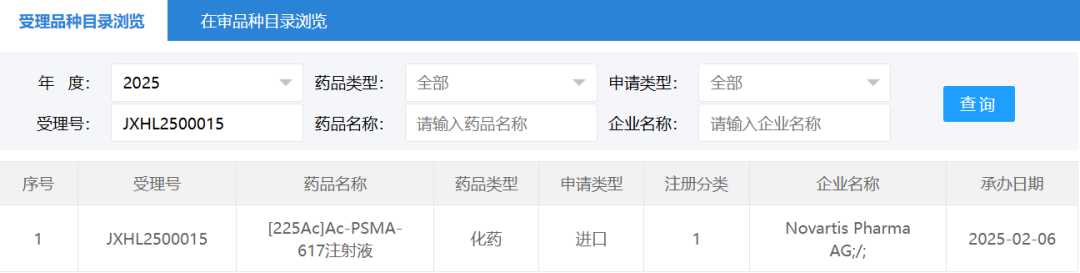近日,据中国国家药监局药品审评中心(CDE)官网公示,诺华(“Novartis”)申报的[225Ac]Ac-PSMA-617注射液的临床试验申请获得受理。[225Ac]Ac-PSMA-617(AAA817)是一款靶向 PSMA的放射性核素偶联药物(RDC),正在开发用于治疗前列腺癌。