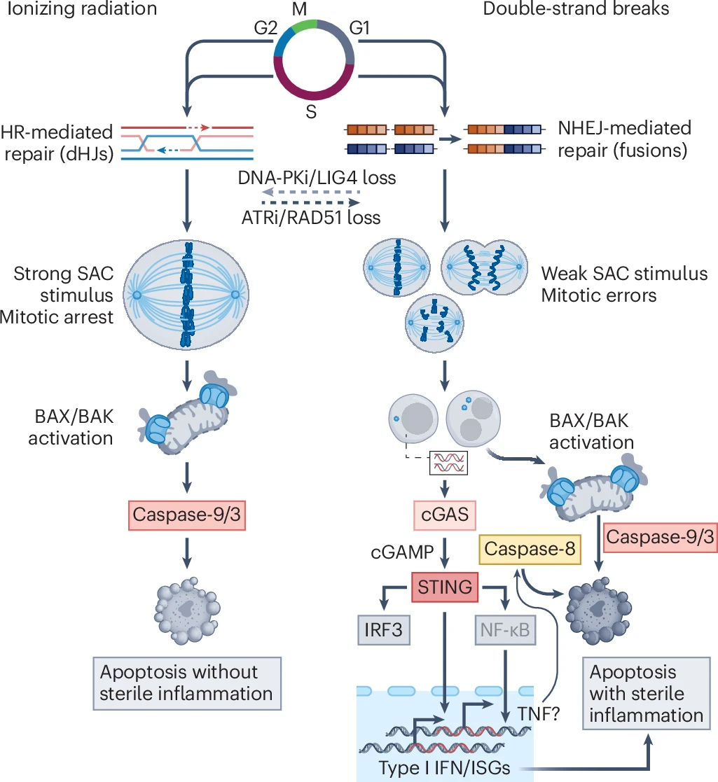 研究发现,细胞周期阶段对DSBs修复后的细胞命运具有决定性作用。在S期或G2期,同源重组的未完成会导致有丝分裂过程中出现毒性中间产物,引发非免疫原性内在凋亡。而在G1期,非同源末端连接(NHEJ)、微同源末端连接(MMEJ)和单链退火(SSA)等修复途径则允许细胞完成第一个细胞周期,但会导致延迟的外源性致死性和干扰素产生。